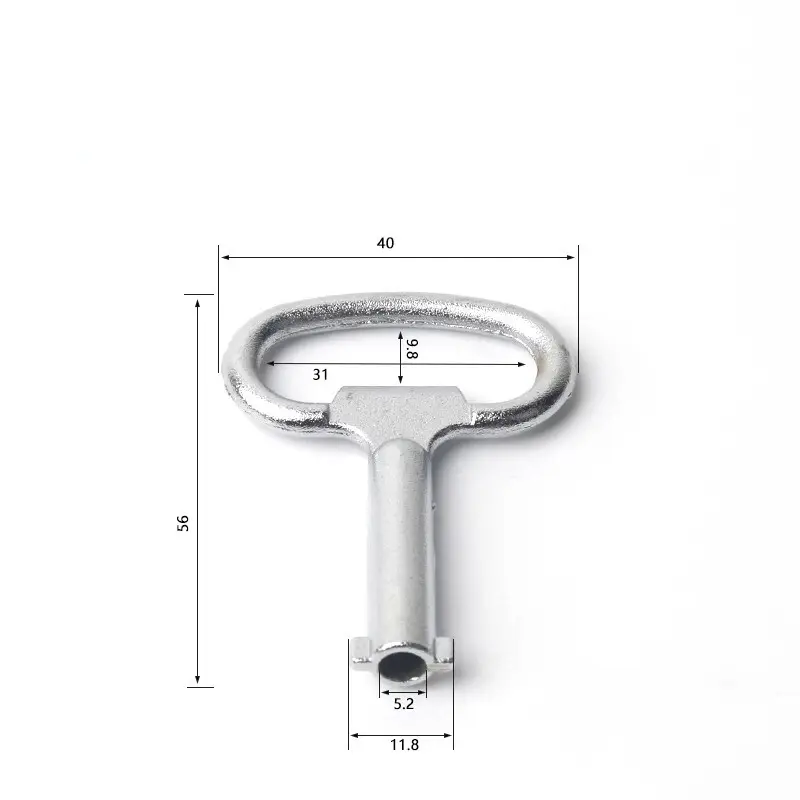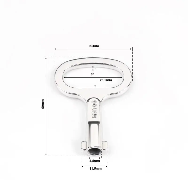 Nikkelbelagt aluminiums dobbeltbit-nøgle: Samlede dimensioner 35 × 50 mm, lås cylindercentrum Diameter 4,5 mm, lås cylindercenter + dobbelttænder diameter 11,5 mm.