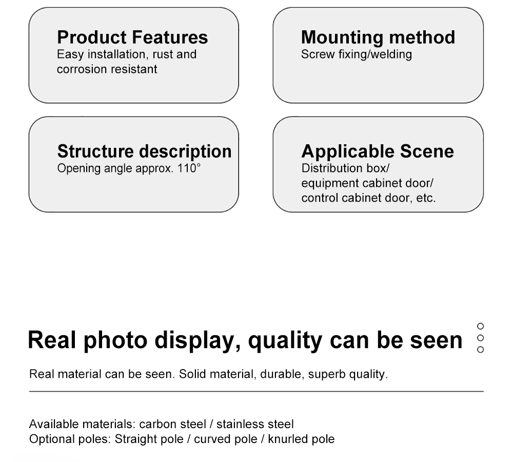 Yitai Lock har Distribution Board Swivel Hinge på lager til industrielle kabinetprojekter. Med en åbningsvinkel på op til 110° giver CL248 Distribution Board Swivel Hinge rigelig plads til ledninger, inspektion og vedligeholdelse. Det kan fastgøres med skruer eller svejsning baseret på kabinetstruktur. Med valgfri lige stang, bøjet stang eller riflet stang tilpasser fordelingspladens drejehængsel sig til forskellige dørkarmlayouts og monteringsmetoder.