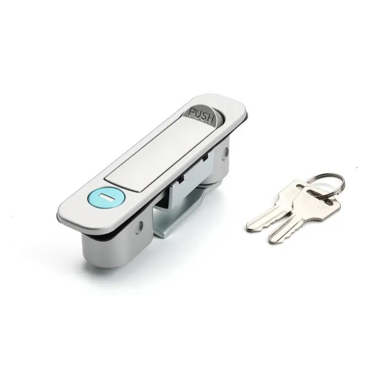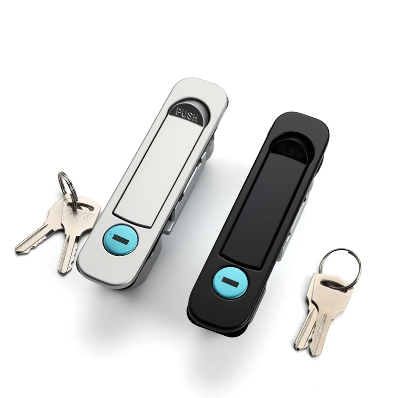 Yitai Locks stålskabsdørlåse gør elektriske komponenter mere sikre. Låsen er monteret i plan med overfladen af skabslågen, hvilket sikrer både æstetisk appel og pladseffektivitet. Låsens jævne og pålidelige betjening sikres af en fjedermekanisme integreret i håndtaget.